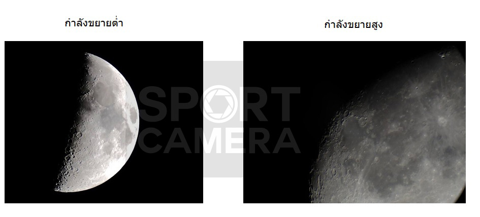 ส่วนถ้ากำลังขยายมากก็จะเห็นวัตถุเป้าหมายในภาพที่แคบเจาะจงไปที่เป้าหมายจะไม่เห็นรายละเอียดรอบๆเป้าหมายมากนัก ดังตัวอย่างภาพถ่ายดาวด้านล่าง