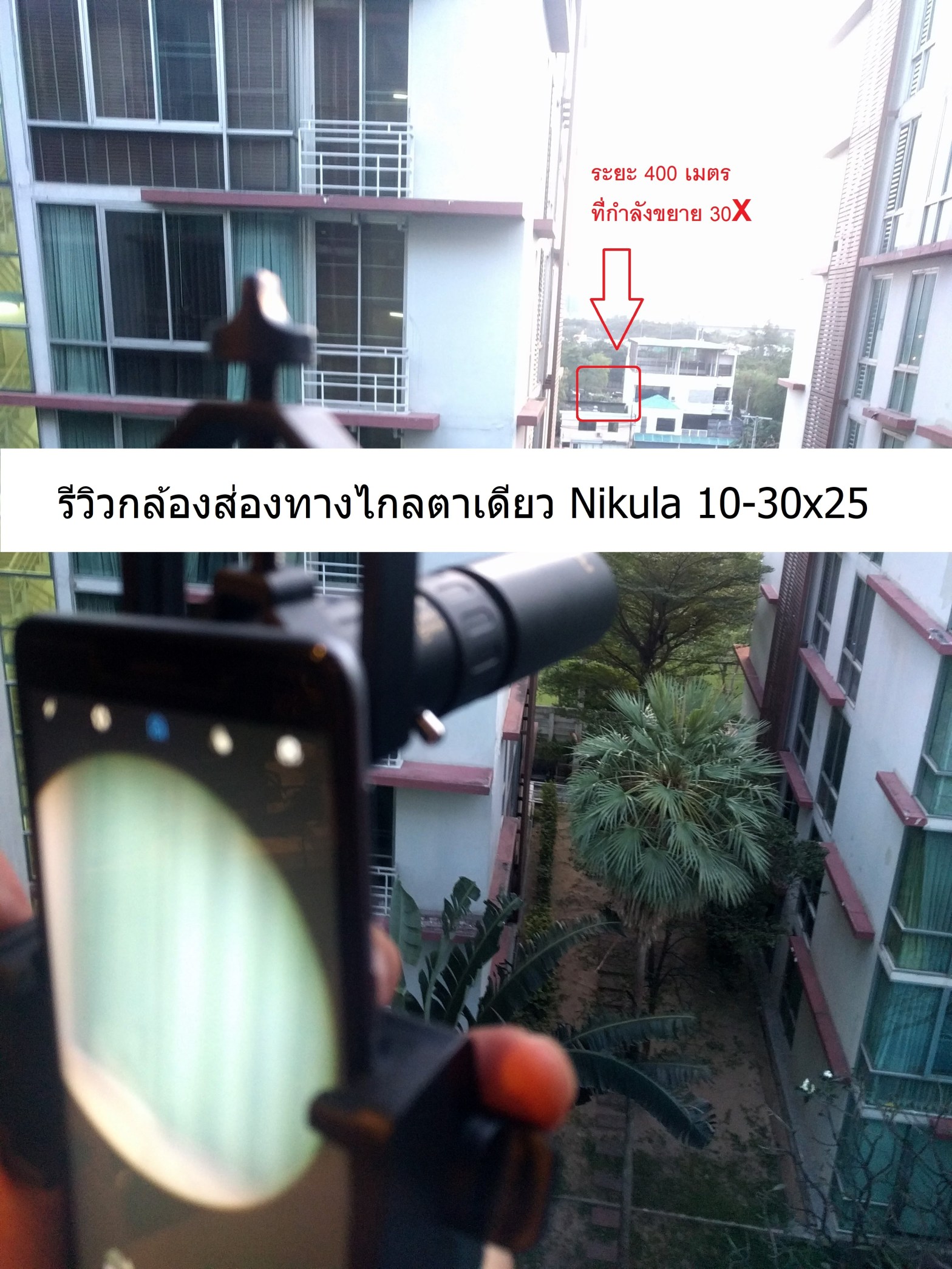 ในการรีวิวกล้องส่องทางไกลตาเดียว Nikula 10-30×25 จะรีวิวระยะ 400 เมตร โดยการถ่ายภาพออกมานั้นต้องใช้ความนิ่งของมือในการจับกล้องมาก เนื่องจากกล้องสั่นมากจริงๆ หากมีขาตั้งกล้องช่วยจะช่วยลดการสั่นของภาพได้ดีมาก ในการรีวิวนี้อุปกรณ์จะมี กล้องส่องทางไกล Nikula รุ่น 10-30×25 และตัวยึดมือถือต่อเข้ากับกล้องมือถือ ดังภาพด้านล่าง